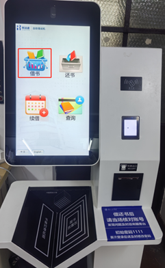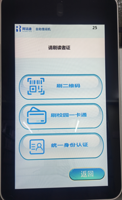 点击自助借还机的“借书”模块,界面显示三种认证方式: