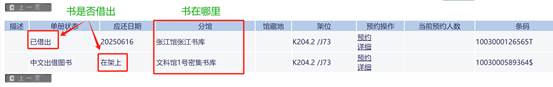 “单册状态”显示每本书的流通状态,系统会标注“已出借”图书的“应还日期”,读者可进行预约。