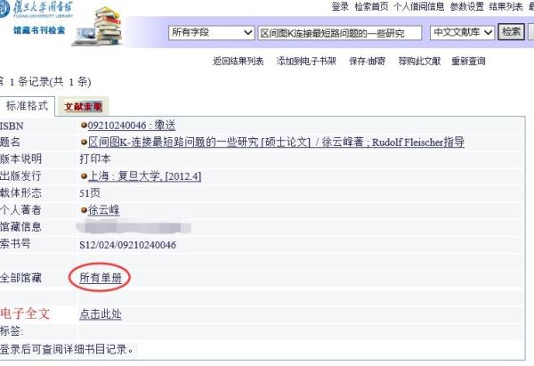 1)在馆藏目录中查到该篇论文,点击“所有单册”