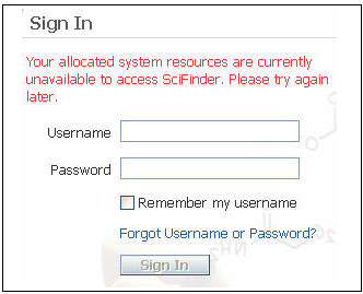 答:SciFinder有用户数限制,我校共9个并发用户,如果出现上图所示的提示,说明同时用户数已满,请稍后使用。