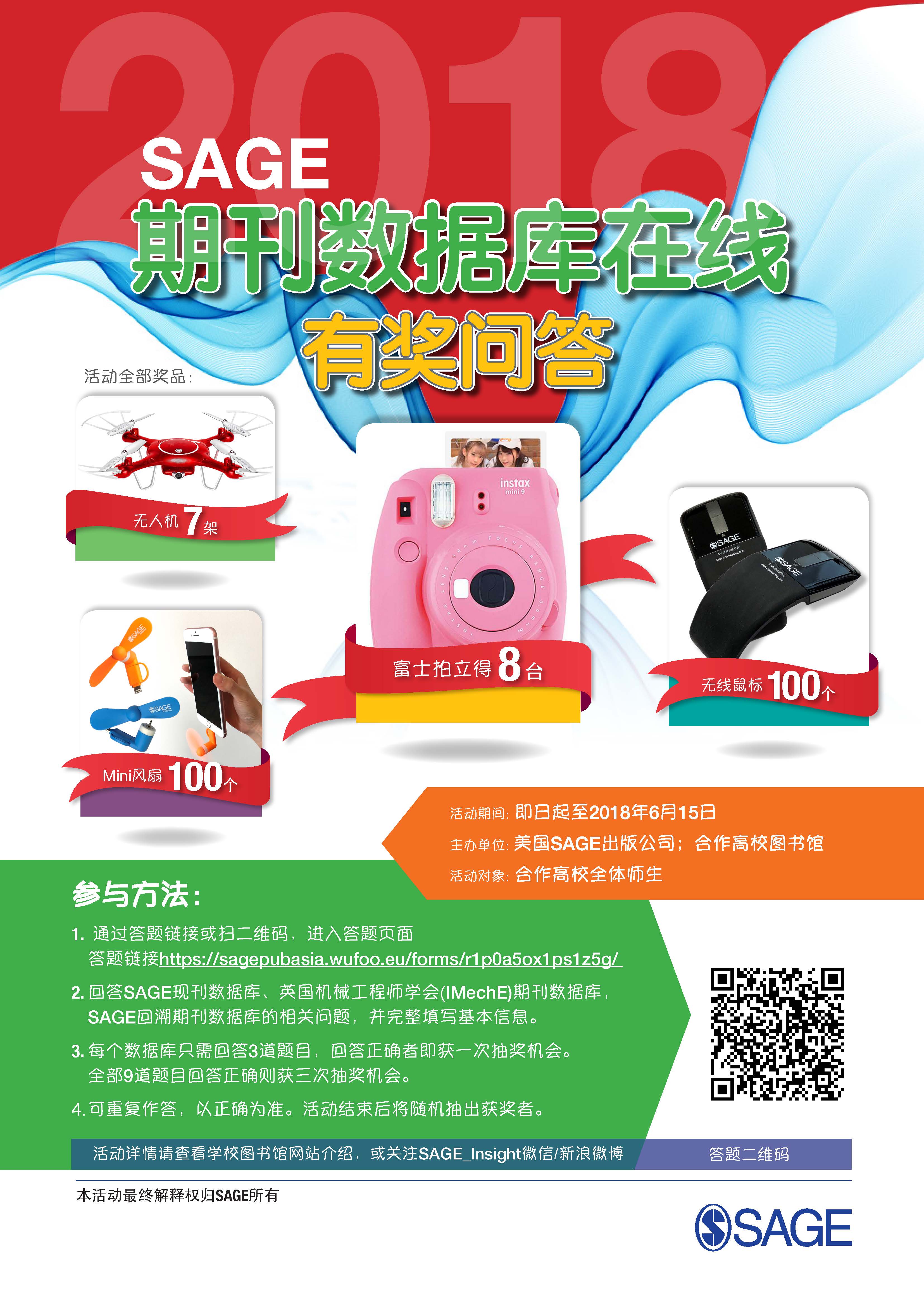 活动内容: 为了帮助广大读者充分了解并利用优质的SAGE数据库资源,更好地支持我校师生的教学和科研,进一步提高SAGE数据库的使用效率图书馆携手SAGE公司,诚邀本校读者参与回答SAGE现刊数据库、SAGE回溯期刊数据库的相关问题。全部答题正确者将有机会参与抽奖。
