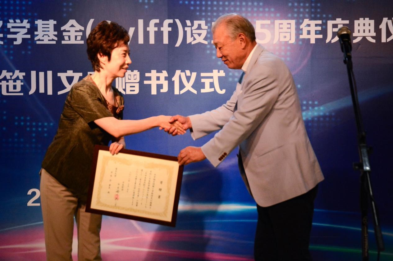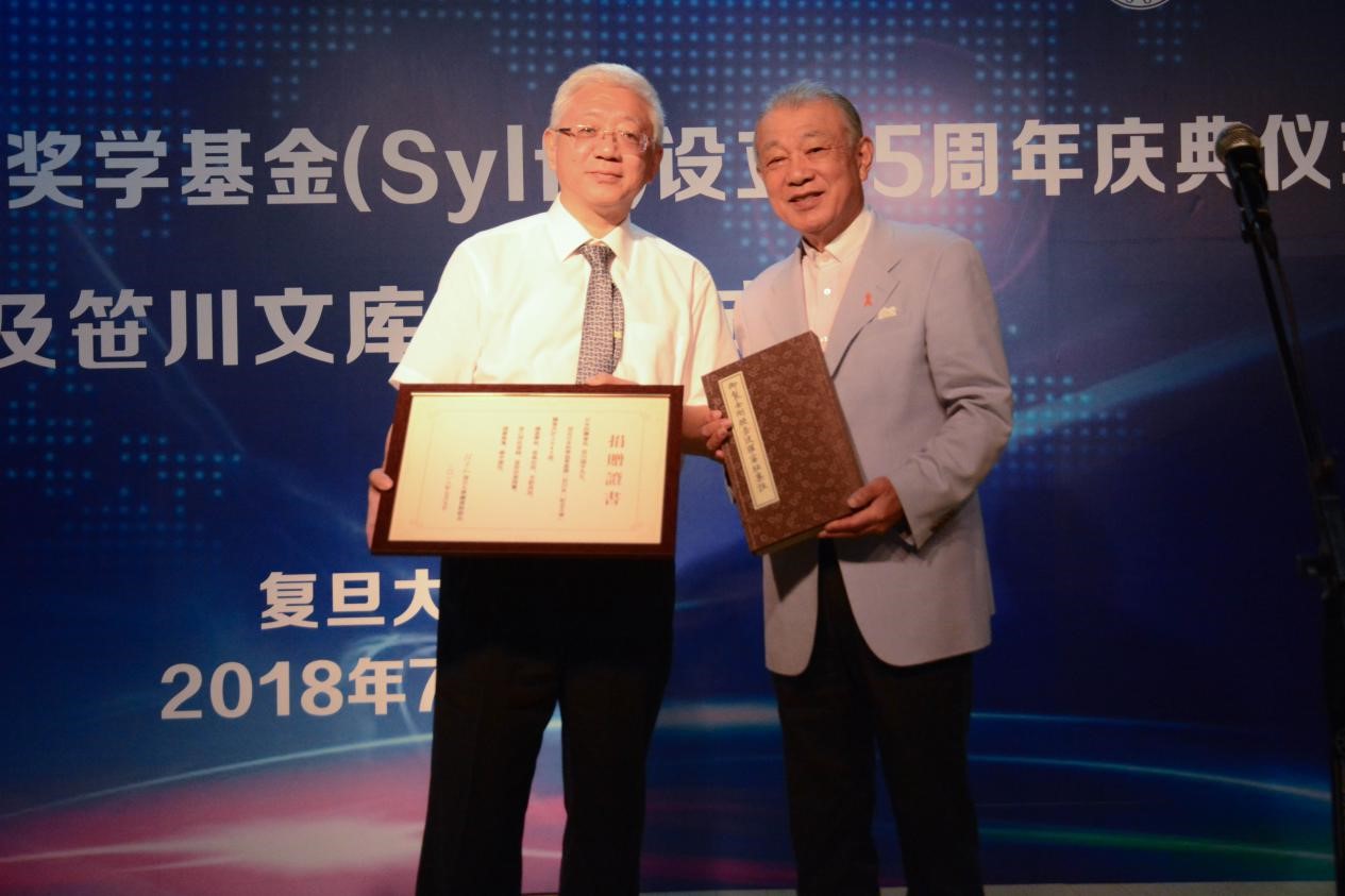 “笹川良一纪念文库”赠书仪式作为Sylff纪念活动的重要环节随后举行。焦扬书记接受笹川阳平会长赠书,复旦大学图书馆陈思和馆长宣读捐赠证书,并与笹川阳平会长互赠礼品。