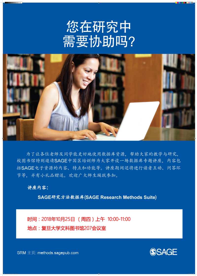 为了让广大读者更好地利用SAGE研究方法在线这一资源,图书馆邀请SAGE中国区培训师为我们开设一场专题讲座,内容包括研究方法的含义、操作方法、研究的意义和功能等,欢迎广大师生踊跃前来参加。
