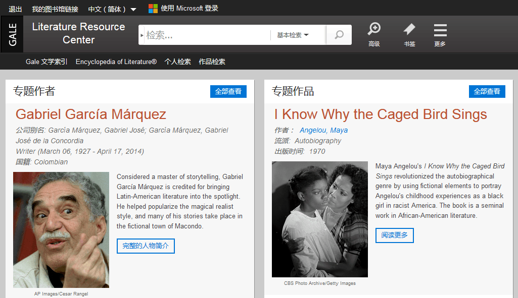 的文学评论和文学分析的全文,以及主题和作品概述、综述、新闻、原始文献资料、图片、音频和访谈的链接等。同时收录两大获奖系列丛书《当代作家》(Contemporary Authors)和《文学传记辞典》(Dictionary of Literary Biography),共计超过160,000个条目,涉及作家及其作品的深度传记、参考书目和背景信息。