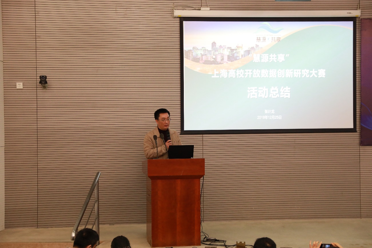 大会最后,复旦大学图书馆副馆长张计龙研究馆员代表大赛组委总结本届大赛。本届大赛从4月22日正式启动,历时8个月,共有上海地区25家高校的284支队伍报名,参赛总人数达871人,最终提交有效作品65项。经过初审、复审和专家答辩,大赛各项奖项最终揭晓。目前活动进入成果孵化阶段,大赛组委将通过优秀论文结集、优秀论文和高质量数据推荐出版、企业合作成果转化等方式为大赛参赛团队提供更多的机会与支持。2020年大赛将汇聚更加丰富的数据资源,邀请更多的数据专家,开展更直接的专业指导,设置更多源的专项奖,拓展更广阔的辐射范围。