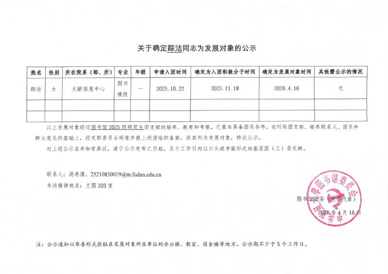 关于确定踪洁同志为发展对象的公示